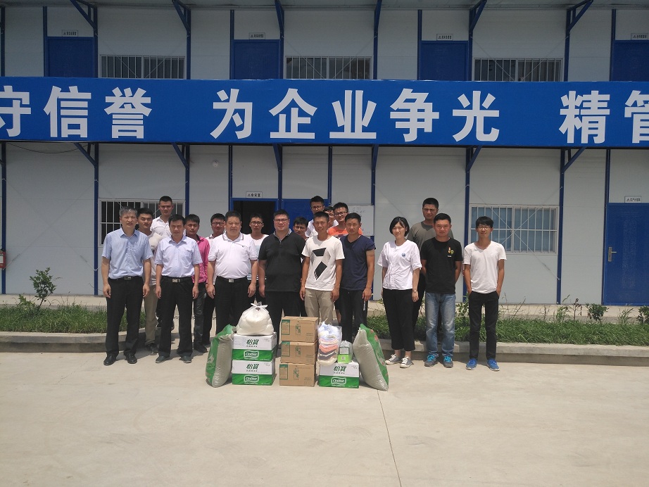 烈日炎炎,熱浪滾滾。連日來(lái),淮北氣溫節(jié)節(jié)攀升,7月22日正值大暑時(shí)節(jié),公司董事長(zhǎng)、總經(jīng)理王軍邦,紀(jì)委書(shū)記、工會(huì)主席李寬旭,總工程師吳繼成一行,來(lái)到淮北和諧新家園項(xiàng)目部“送清涼”,親手將一袋袋綠豆,一條條毛巾,一盒盒仁丹、清涼油,一箱箱礦泉水等防暑降溫物品,送到頂著高溫,堅(jiān)守在生產(chǎn)崗位的項(xiàng)目員工手中,給奮戰(zhàn)在一線的員工們送上沁人心脾的絲絲涼爽和無(wú)微不至的親切關(guān)懷。