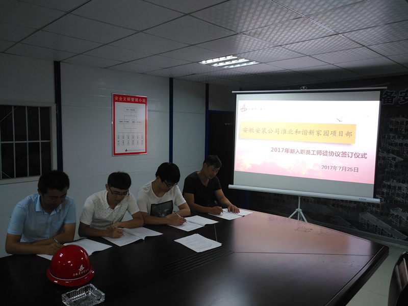 7月25日晚,安徽安裝公司淮北和諧新家園項目部精心策劃,嚴密組織,精選出思想作風扎實,工作經驗豐富,專業(yè)素質過硬的老師傅與新入職員工舉行莊重的師徒協議書簽訂儀式。