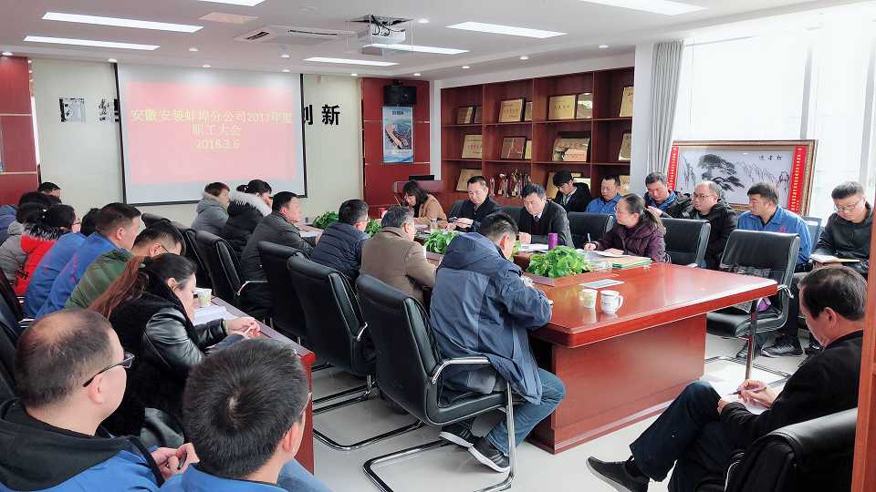 2018年3月6日,蚌埠分公司召開2017年度職工大會,公司黨委書記、副總經理胡六中,工會主席、紀委書記李寬旭出席會議。會上對蚌埠分公司領導班子及成員進行了2017年度民主考核。分公司全體員工參會。會議由分公司黨支部書記洪軍主持。