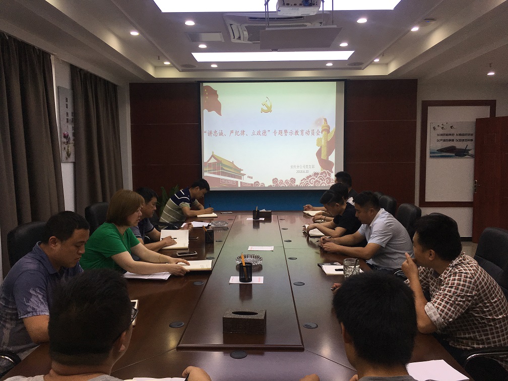 6月20日下午,安慶分公司黨支部召開了“講忠誠、嚴紀律、立政德”專題警示教育動員擴大會議,分公司全體員工參加動員會。