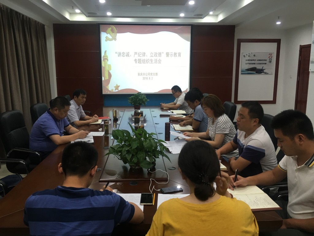 8月2日下午,安慶分公司黨支部組織召開了“講忠誠、嚴(yán)紀(jì)律、立政德”警示教育專題組織生活會(huì),公司董事長、總經(jīng)理、黨委副書記王軍邦,紀(jì)委書記、工會(huì)主席李寬旭到會(huì)指導(dǎo)。分公司領(lǐng)導(dǎo)班子成員、支部黨員參加了會(huì)議,會(huì)議由分公司黨支部書記劉紅艷主持。