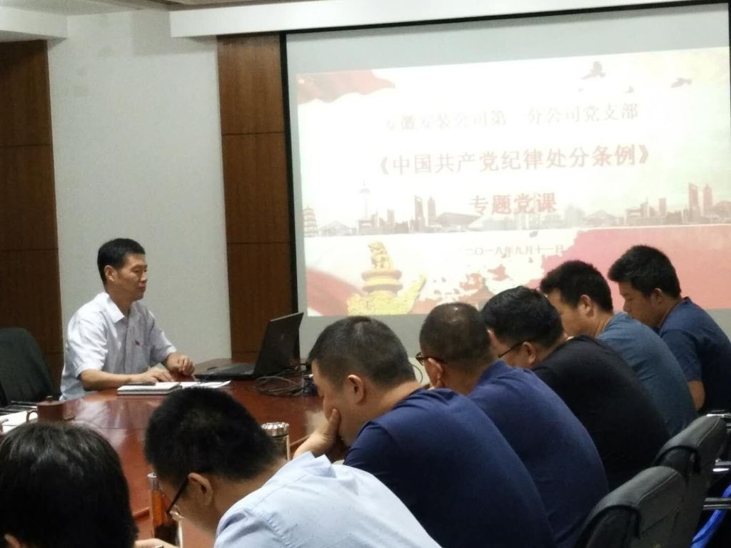 9月11日,第一分公司黨支部開展“黨支部書記上黨課”主題黨日活動。分公司黨支部書記胡迎東以新修訂的《中國共產黨紀律處分條例》為主題,采用PPT的形式為全體黨員、分公司領導班子成員、機關部門負責人、在肥項目經理上了一堂生動的黨課。