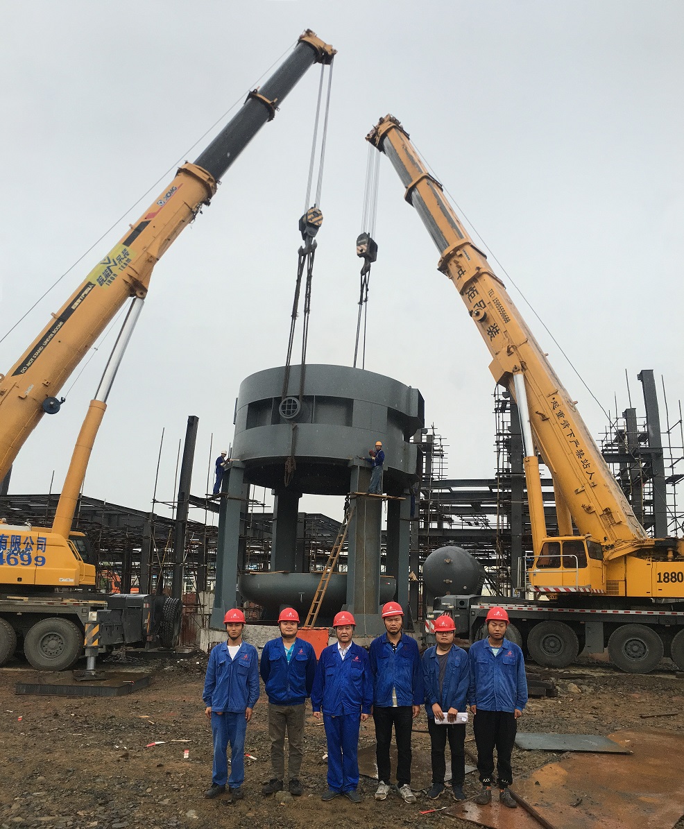 本次吊裝的反應(yīng)器中段部分重達(dá)220噸,分公司領(lǐng)導(dǎo)高度重視,吊裝前期,邀請公司總工吳繼成、總工辦主任牛守義和安全部王岳濤經(jīng)理親臨項(xiàng)目部參與設(shè)備吊裝的專題方案討論定稿工作。當(dāng)日上午,吊裝現(xiàn)場準(zhǔn)備工作緊張卻又有條不紊的進(jìn)行,項(xiàng)目經(jīng)理李子鳳向全體“參戰(zhàn)”員工進(jìn)行了安全交底,工作人員對兩臺分別為500T、350T吊車的站位及性能再次確認(rèn),現(xiàn)場機(jī)具、人員均按既定方案實(shí)施。分公司經(jīng)理史崇松、業(yè)主單位負(fù)責(zé)人、監(jiān)理全程在現(xiàn)場“督戰(zhàn)”,全體工作人員經(jīng)過四個(gè)小時(shí)的奮戰(zhàn),吊裝作業(yè)圓滿結(jié)束。