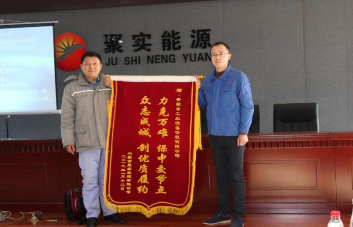 2019年1月14日,安徽安裝承建的內蒙古聚實能源有限公司焦化升級改造生產清潔化學品項目,克服工期緊、任務重、施工難度大等諸多困難,安全、高效、優質的圓滿完成了工程建設任務。業主內蒙古聚實能源公司總經理張春軍向公司贈送內容為“力克萬難 保中交節點;眾志成城 創優質履約”的錦旗。