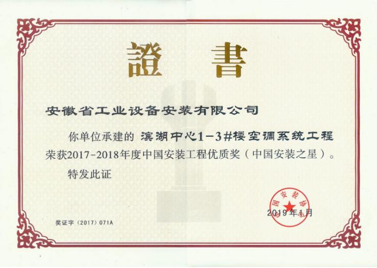 2019年4月17日,中國安裝協會在珠海召開第六屆七次理事(擴大)會議暨工程創優經驗交流會,會上表彰了2017-2018年度中國安裝工程優質獎(中國安裝之星),安徽安裝承建的“合肥市濱湖中心1#-3#樓空調系統工程”項目榮獲該項榮譽。