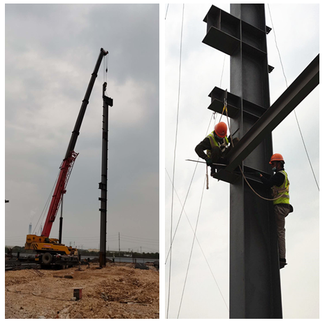 伴隨著隆隆的吊車轟鳴聲,閃爍的電焊火花,縱橫交錯的鋼構架拼裝,一道道工序正在有條不紊的進行著……這是走進蕪湖宇培年產50萬方建筑工業化構件生產基地項目鋼結構工程,看到的一片繁忙施工景象。因受疫情的影響,項目部2020年3月5日接到總包的復工復產通知,3月6日立即組織召開復工會議,全面部署防疫”舉措和生產任務。在做好施工必備的人、材、機進場和安全教育及技術交底后,3月11日,當第一根27米高的廠房跨立柱穩穩地吊裝成功后,項目部全面啟動,按下搶工“快進鍵”。