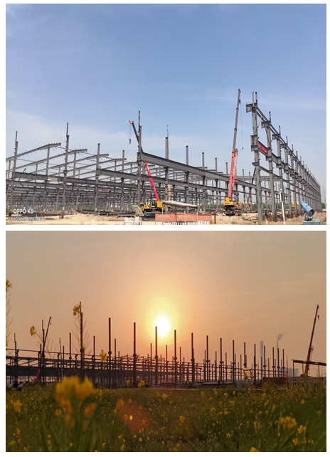 為進一步調動參建人員的積極性和創造性,分公司組織開展項目“大干90天”勞動競賽,有效形成了一片“比、學、趕、幫、超的火熱生產局面。盡管3月底持續陰雨天氣,但絲毫沒有影響到月施工進度,2#車間整體框架已全部按時間節點圓滿完成。目前,1#車間安裝正在高速推進。