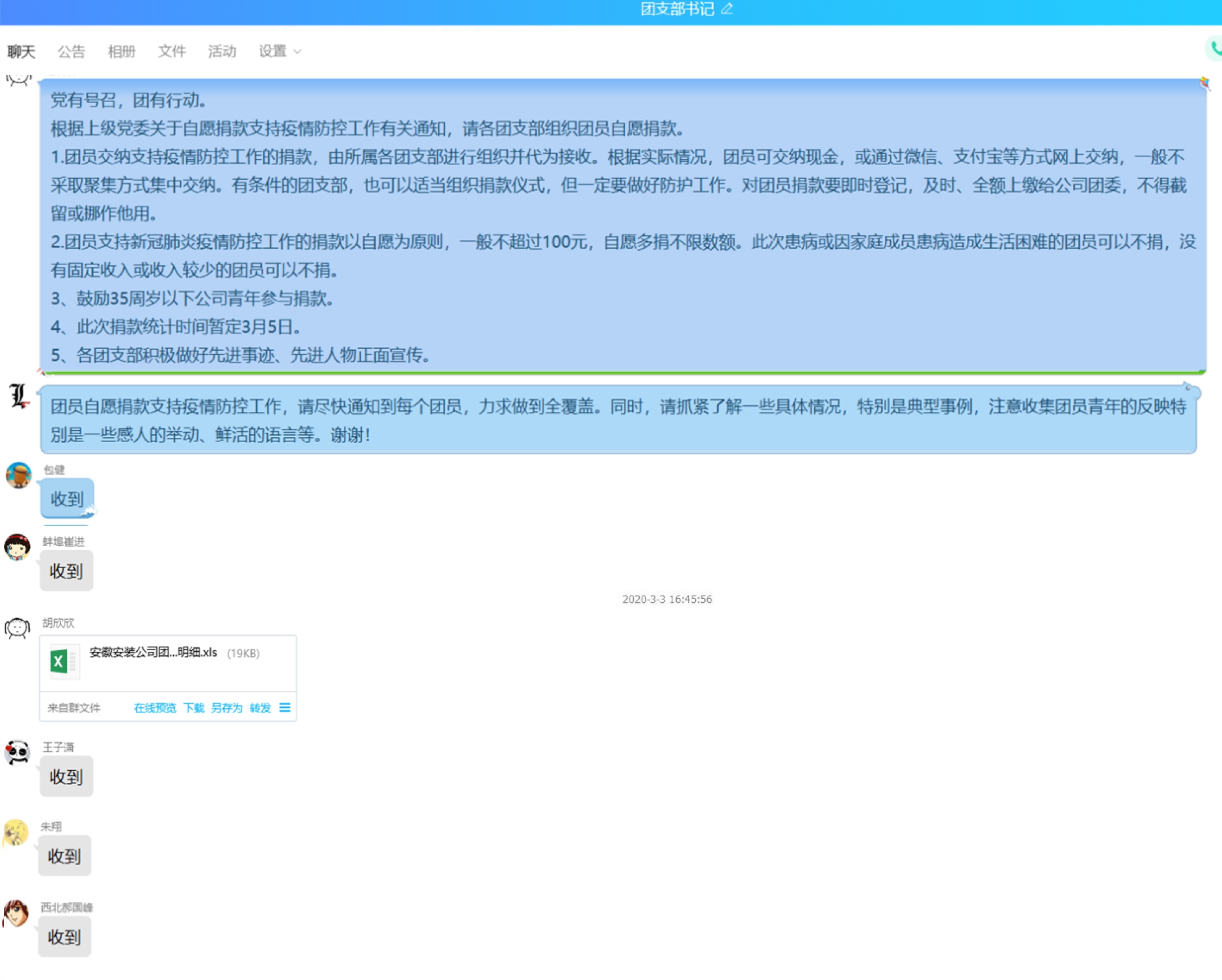 在這次疫情“抗戰”中,安徽安裝公司的團員青年們在各自的崗位堅守陣地,貢獻力量。各團支部書記帶頭“作戰”,有的積極配合社區進行防疫登記,有的堅守崗位做好公司防疫消毒工作,有的在項目一線積極進行防疫宣傳。各團員青年充分發揮生力軍作用,機關團支部徐君婷給社區捐獻了51N95口罩,合肥團支部陳濤濤、馮俊、蚌埠分公司團支部王大旭等為公司想方設法采購防疫物資,西北分公司團支部劉金蓮給當地紅十字會捐款······他們以實際行動亮身份樹形象, 當好“戰斗員”,當好“宣傳員”,助力身邊的疫情防控工作,依法科學有序參與疫情聯防聯控。