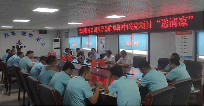 7月16日上午,股份公司副總經(jīng)理黃代、證券事務(wù)部副部長(zhǎng)盛道勝赴安徽安裝公司阜陽(yáng)潁東區(qū)中醫(yī)院建設(shè)PPP項(xiàng)目“送清涼”并調(diào)研指導(dǎo)工作。安徽安裝黨委書(shū)記、董事長(zhǎng)胡六中,副總經(jīng)理高飛參加調(diào)研。