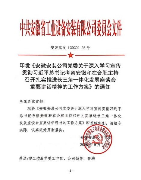 一是公司黨委迅速嚴(yán)密部署學(xué)習(xí)宣傳貫徹各項工作。9月8日,公司黨委理論中心組率先帶頭,認(rèn)真學(xué)習(xí)重要講話精神,深刻交流研討。9月14日,安徽安裝公司黨委下發(fā)《關(guān)于深入學(xué)習(xí)宣傳貫徹習(xí)近平總書記考察安徽和在合肥主持召開扎實推進(jìn)長三角一體化發(fā)展座談會重要講話精神的工作方案》,結(jié)合公司實際,精心嚴(yán)密部署“大學(xué)習(xí)”“大宣傳”“大貫徹”和“大落實”工作,確保公司上下人人都學(xué)習(xí),人人都領(lǐng)會。