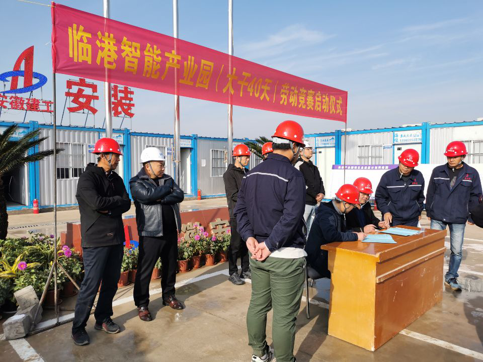 為確保年度各項目標任務順利完成,貫徹落實集團公司開展“戰疫情、搶工期、保目標、促超產”為主題勞動競賽活動精神,2020年11月19日上午,安徽安裝召開蚌埠臨港項目“大干40天”勞動競賽動員會。公司紀委書記、工會主席李寬旭,公司相關部門負責人,業主現場派駐代表李先鋒,總監代表姚明,項目勘察單位、設計單位代表,蚌埠分公司領導班子成員,項目管理人員和勞務單位共計50余人參加活動。