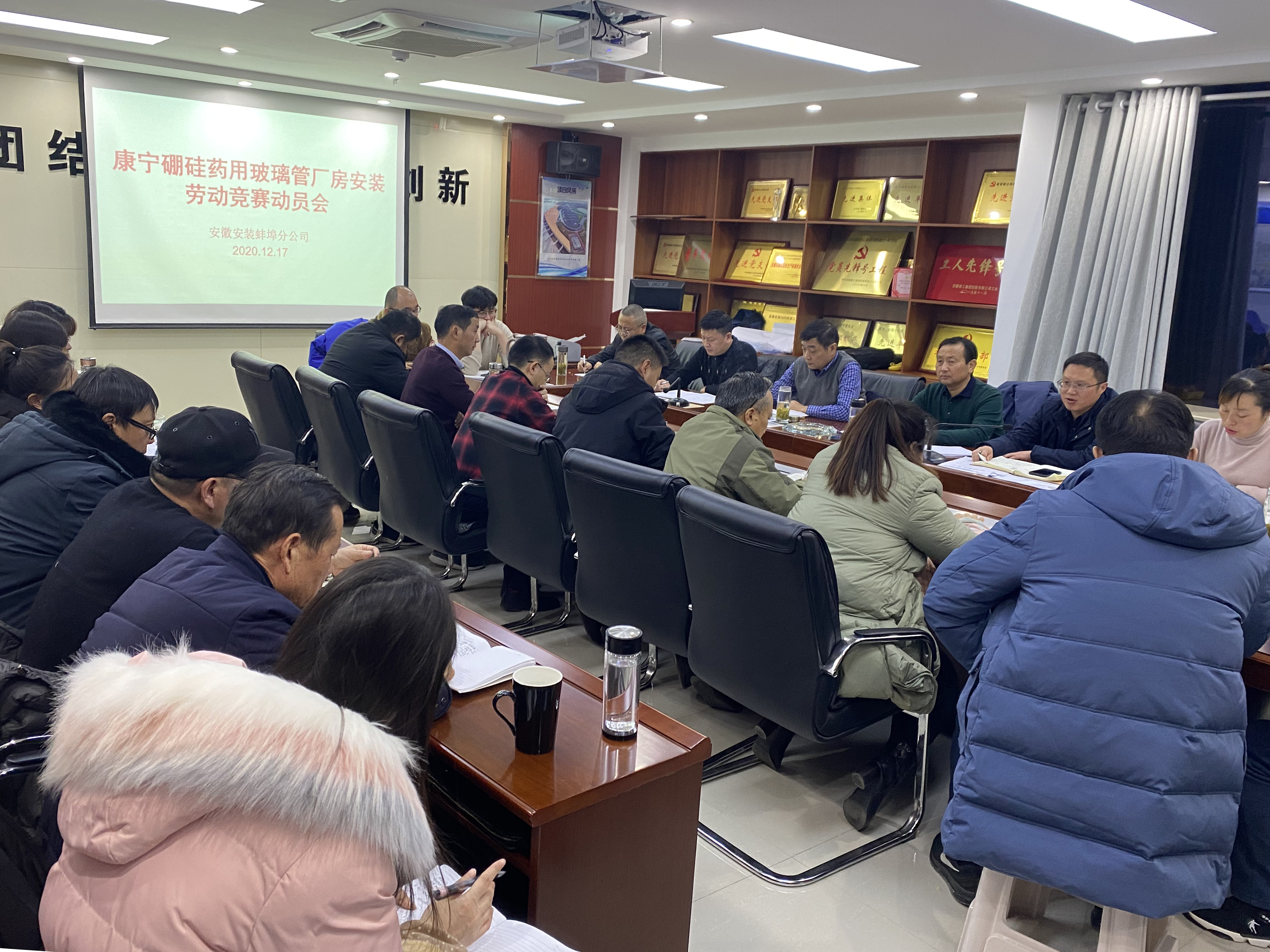 為加快推動康寧硼硅醫用玻璃項目全面快速達產,充分調動員工工作的主動性和積極性,貫徹落實集團公司“戰疫情、搶工期、保目標、促超產”為主題的勞動競賽活動精神,12月17日晚,蚌埠分公司召開康寧項目“大干100天,決戰3.31”的勞動競賽動員會。公司副總經理、現場施工管理指揮部副指揮長劉安俊(常務)和高飛,公司工程管理部、經營部、物資部、招標辦、紀檢監察室負責人及分公司領導班子成員、參戰項目管理人員及分公司機關全體人員30余人參加會議。
