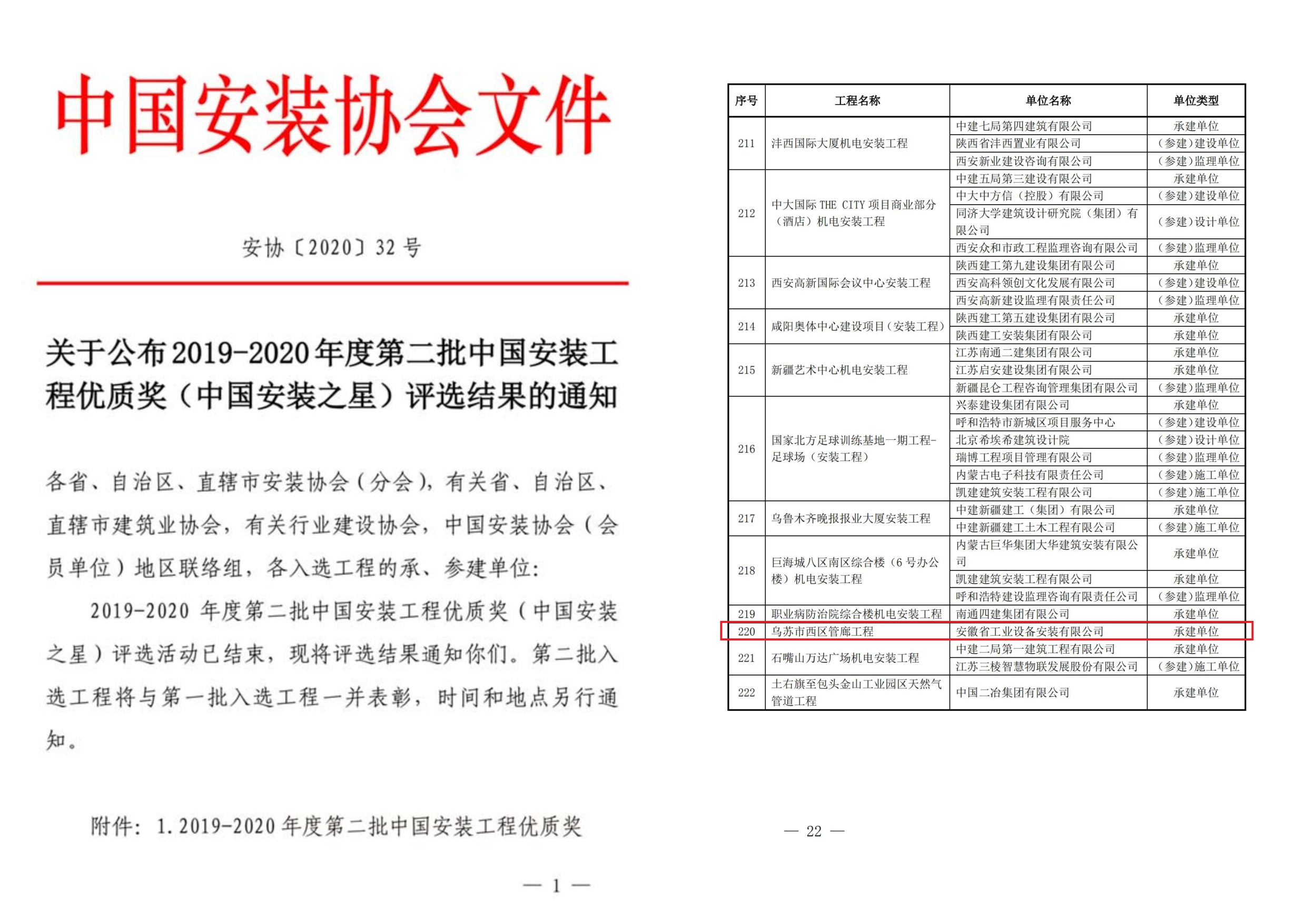 12月10日,經中國安裝協會評選,由安徽安裝公司承建的新疆烏蘇市西區管廊工程成功獲得中國安裝工程優質獎 (中國安裝之星),這也是我公司首獲的工業設備安裝類中國安裝工程優質獎。