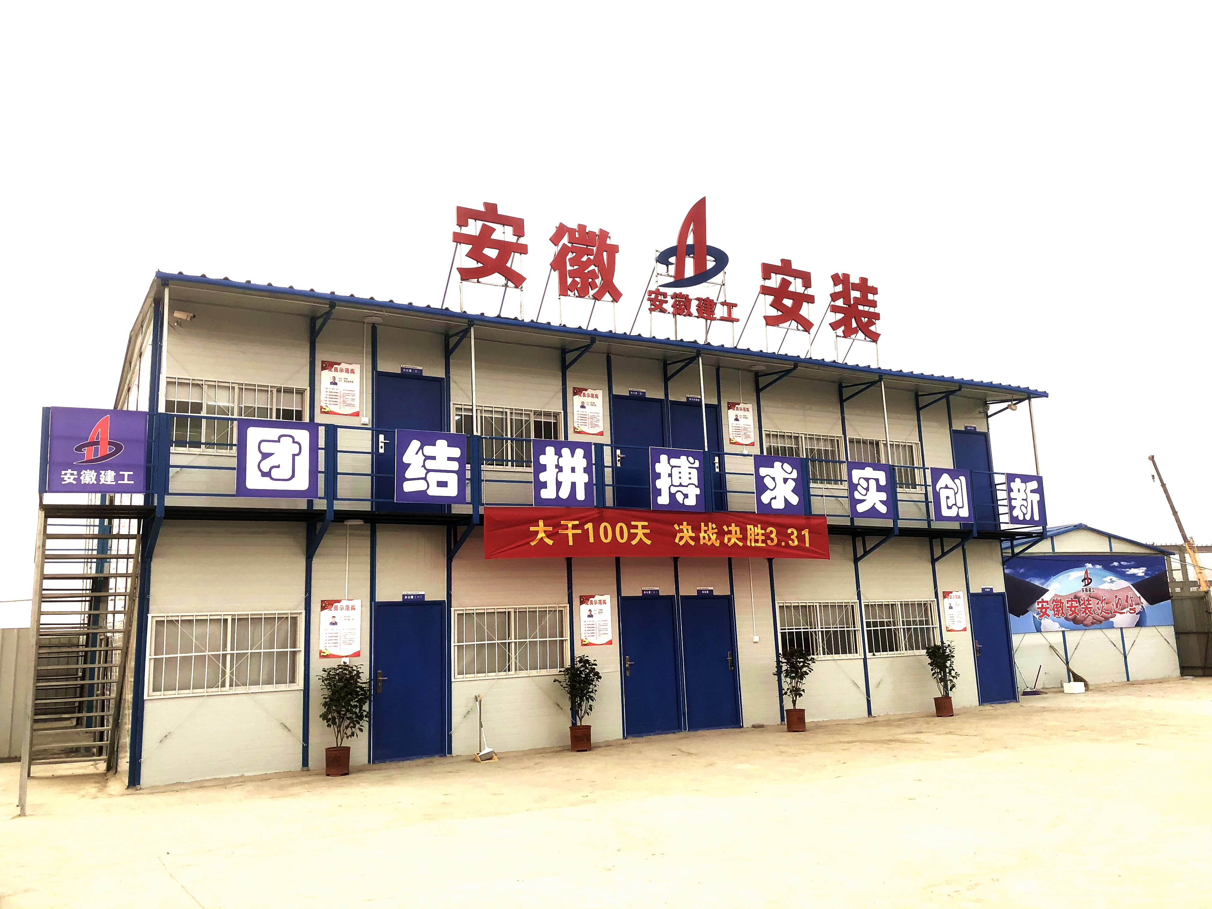 12天前,新項目部所在地還是一片荒地。如今,一排排錯落有致的活動板房,統一著裝的職工們忙碌的身影,房頂上閃亮的“安徽安裝”四個大字,獨具特色的企業文化宣傳標語,無不展示著廣大職工積極向上的精神風貌和“團結 拼搏 求實 創新”的企業精神。