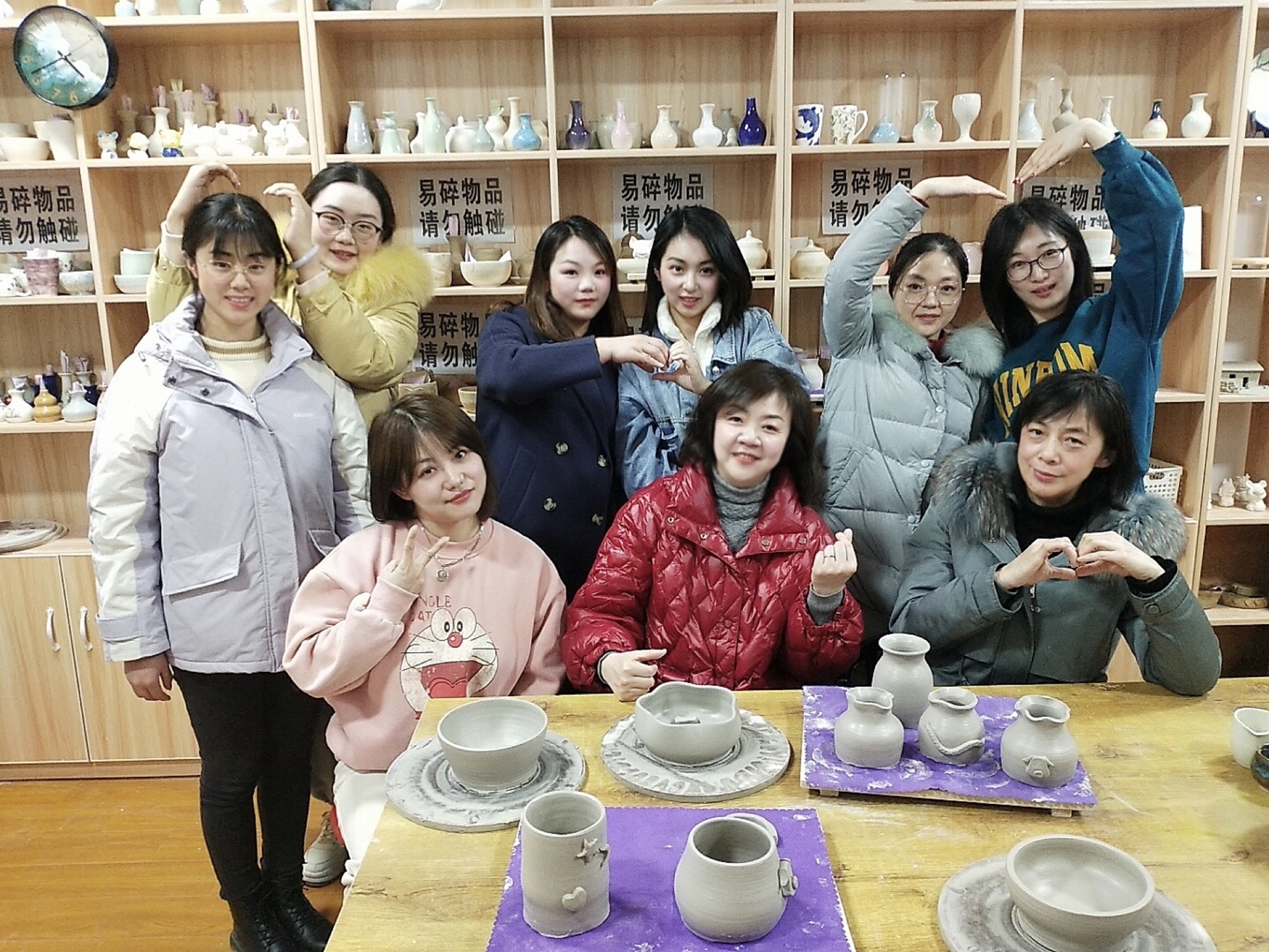 在拍攝創(chuàng)意照片活動(dòng)中,女職工們身穿工作服,手拿慶祝節(jié)日?qǐng)D片,展現(xiàn)女職工風(fēng)采。同時(shí),以手臂為造型,共同組成心型圖案,寓意同心啟程“十四五”,為公司發(fā)展助力。在之后開(kāi)展的手工陶藝活動(dòng)中,女職工們?cè)谔账囍谱鲙煹闹笇?dǎo)下,利用轉(zhuǎn)動(dòng)的輪盤(pán),動(dòng)手將瓷土拉制成各種形狀的拉胚,并對(duì)陶藝進(jìn)行塑型雕花,制作出一件件精美的陶藝作品。