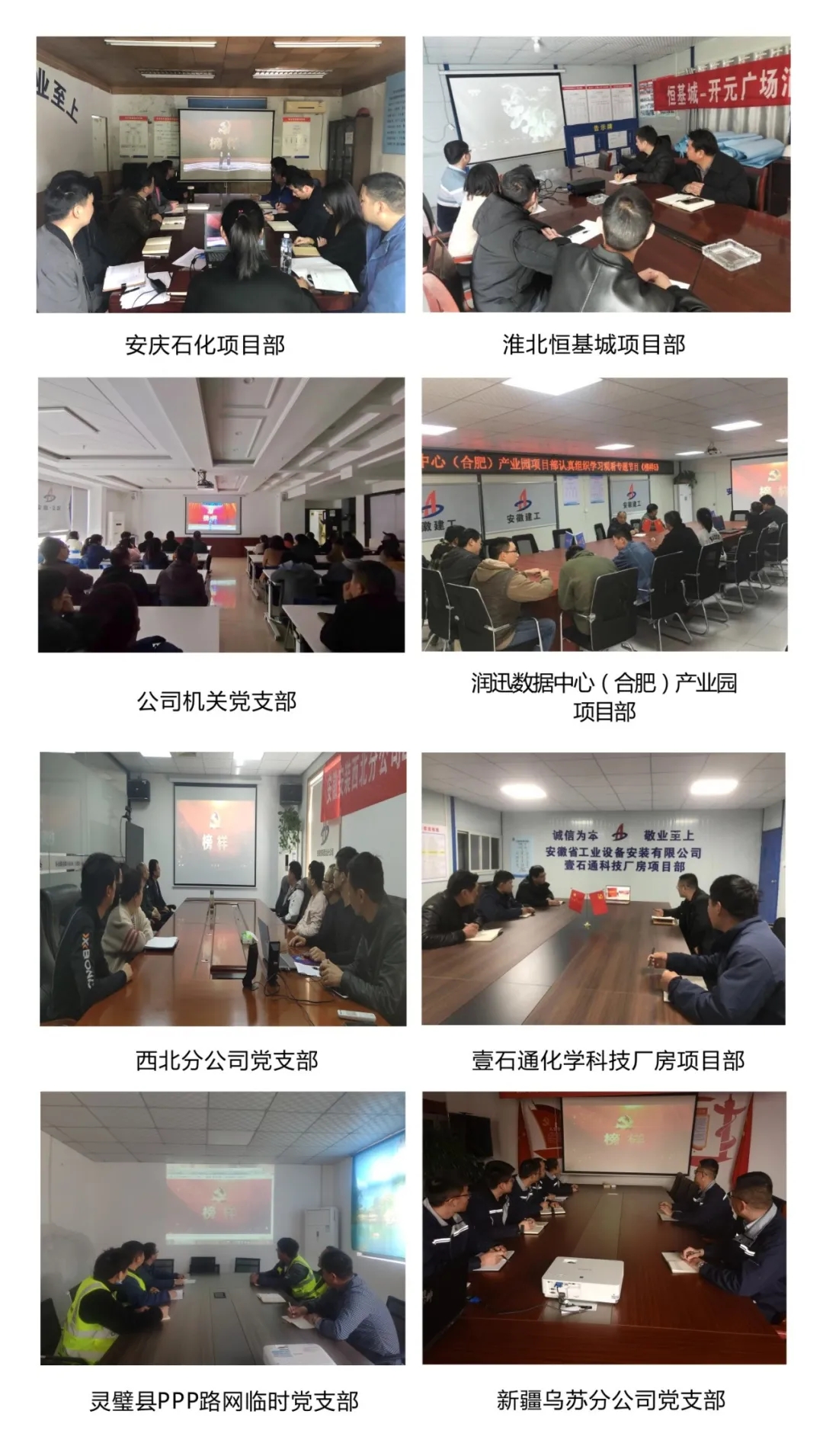 靈璧縣PPP路網(wǎng)臨時黨支部、壹石通化學(xué)科技廠房項目、潤迅數(shù)據(jù)中心(合肥)產(chǎn)業(yè)園項目、蚌埠康寧藥用玻璃管項目、安慶石化項目部于3月22日晚上立即組織共同觀看《榜樣5》,并視頻討論、召開會議等多種形式進行學(xué)習(xí)交流。