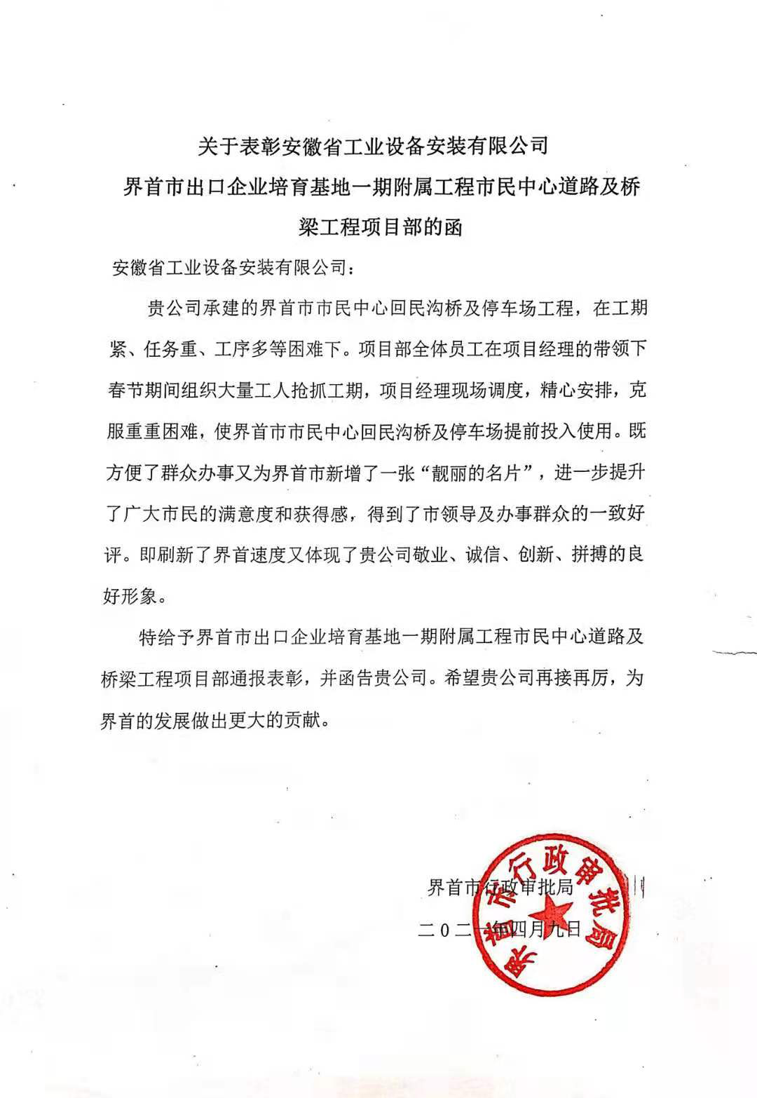 為此,界首市行政審批局發(fā)來(lái)表彰函,表彰界首市出口企業(yè)培育基地一期附屬工程市民中心道路及橋梁工程項(xiàng)目部在工程任務(wù)中的優(yōu)秀表現(xiàn),相信項(xiàng)目部全體人員會(huì)一如既往秉持“團(tuán)結(jié)、拼搏、求實(shí)、創(chuàng)新”的企業(yè)精神,繼續(xù)努力,為城市的建設(shè)、企業(yè)的發(fā)展作出更大的貢獻(xiàn)!