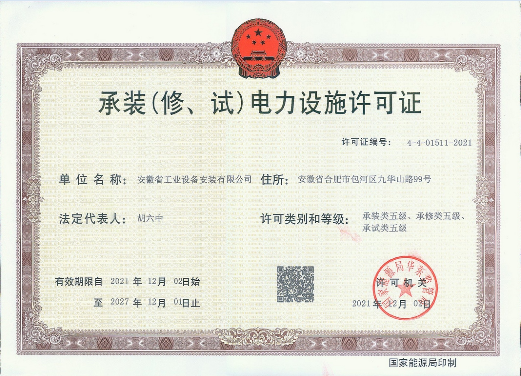 安徽安裝公司順利取得承裝(修、試)電力設施許可證資質