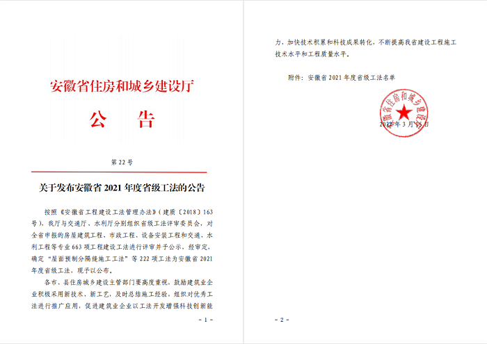 近日,安徽省住房和城鄉建設廳第22號公告公布2021年度安徽省省級工法名單,安徽省工業設備安裝有限公司的《大跨度結構滾軸式滑動支座安裝工法》、《活動式橋架安裝施工工法》、《大型儲罐制作同步提升施工工法》和《機房密集管道分區塊預制安裝工法》榜上有名。