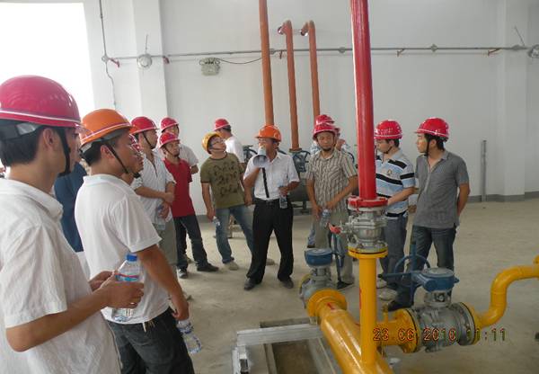 觀摩開始前,戴書記及包處長進行動員講話,要求大學生一定要認真聽講,珍惜這次觀摩學習的機會。項目部經理趙永峰詳細介紹了工程概況及項目部對本工程的現場管理和安全生產、文明施工管理情況。業主周工對合成車間一、合成車間二的管道走向及工藝流程一一向大家講解,并對公用部分的設備功能逐一進行了詳細的介紹。項目部鄭圣軍和徐松同志分別介紹了工藝管道、設備安裝和電氣安裝的相關流程。講解人講解細致,大學生們聽得認真。