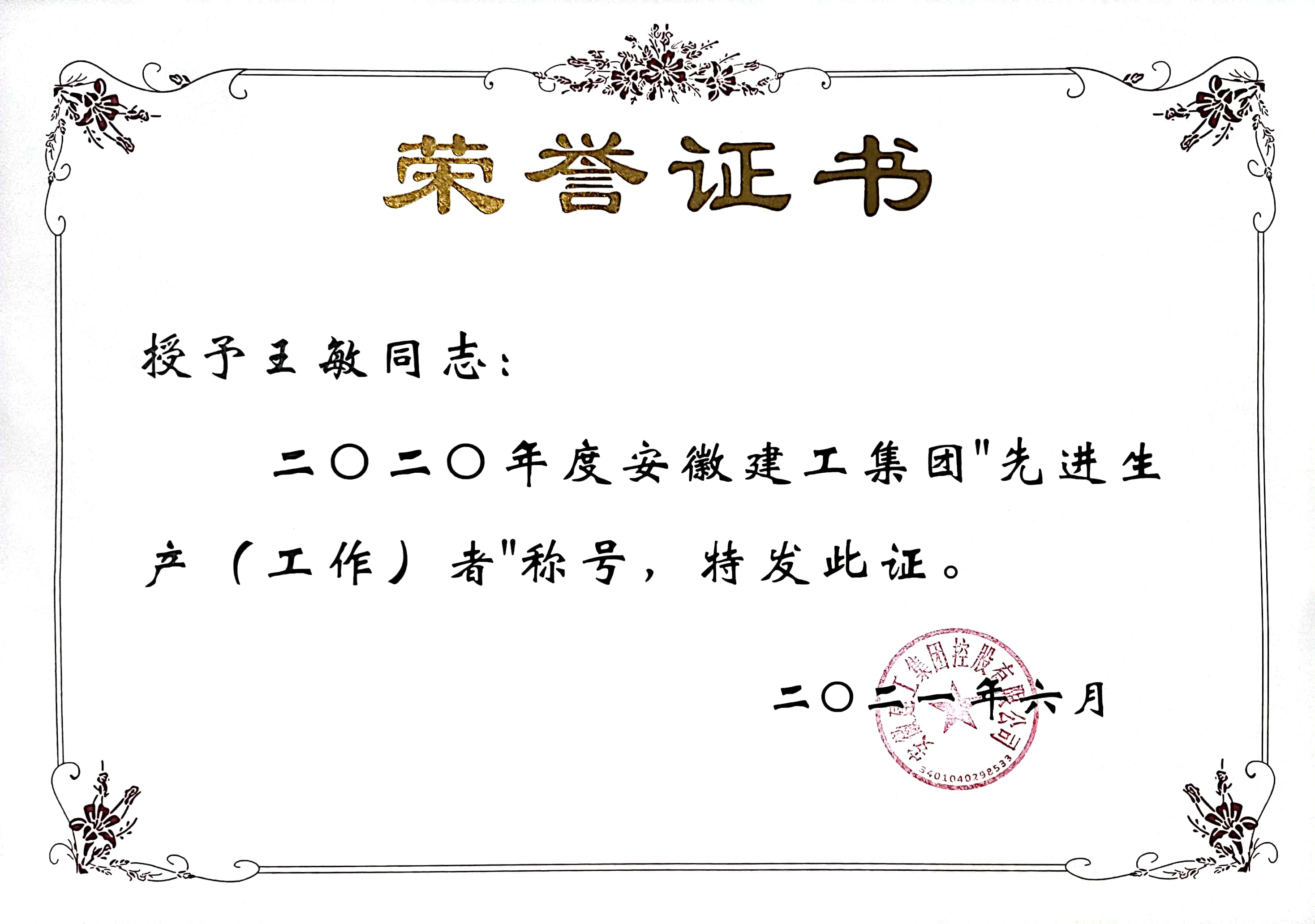 在工作作風上,王敏一貫堅持對自己高標準嚴要求,腳踏實地,勤奮敬業,認真細致,勤于思考,盡心盡責,主動、積極地做好每一項工作,認真履行崗位職責。她時常告誡自己要以德服人,以身作則,并在實際工作中努力實踐著這一思想 ,注重自己的一言一行,公正、客觀,一切從大局出發,不謀私利,不圖己便,廉潔自律,做到自重、自省、自警和自勵。2021年,王敏由于出色的工作成績,被評為“安徽建工集團2020年度先進生產(工作)者”,她說,這是集團對她過去工作的肯定,也是對她未來工作的要求。