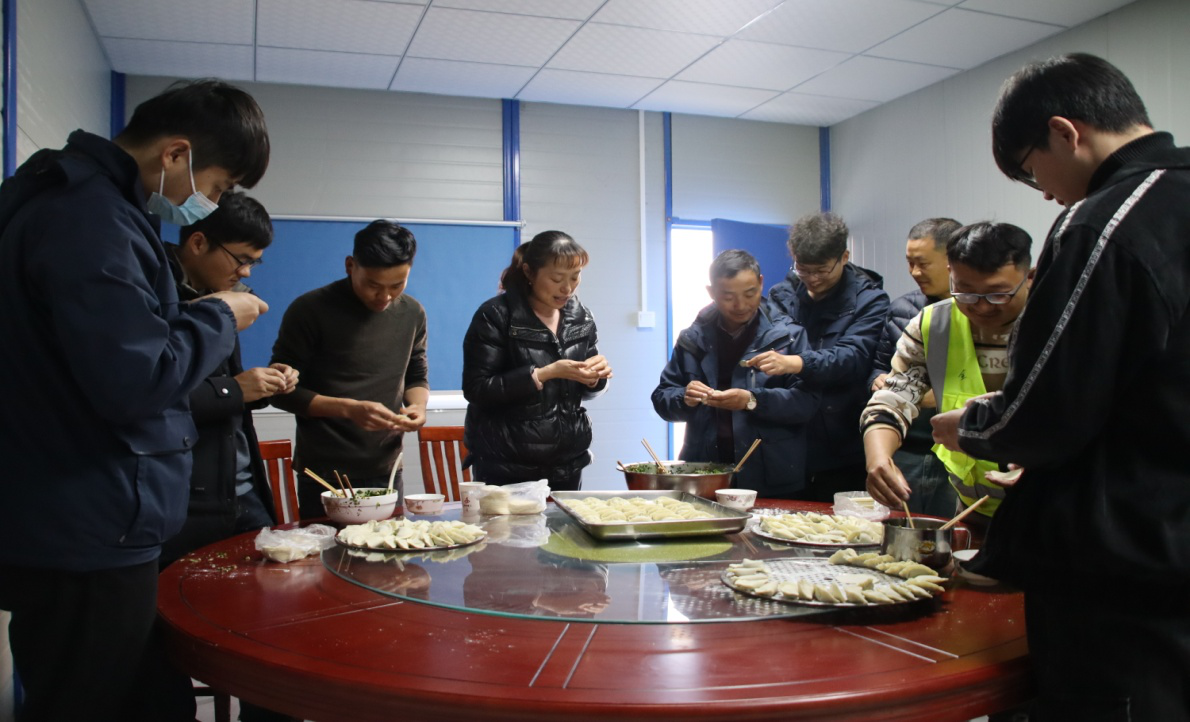 在整個包餃子過程中,大家熱情高漲,積極參與,分享經(jīng)驗,不一會兒,一排排餃子就成型了,有的用料十足,包出的餃子個大肚圓;有的用料較少,包出的餃子小巧美觀。元寶餃子、月牙餃子、麥穗餃子……項目部到處洋溢歡聲笑語,彌漫著“家”的味道、“家”的溫馨。