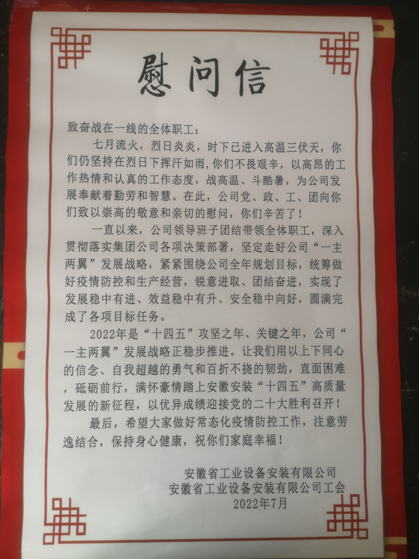 隨后在項目部會議室,李楊對集團和公司兩級“十四五”發展戰略與規劃進行了宣貫解讀。隨后代表公司向奮戰在一線的項目部員工表示慰問和感謝,送來了防暑降溫慰問品和慰問信,并與項目部員工進行了親切交談。在談話中,李楊鼓勵項目部青年員工和新大學生要樹立好正確的世界觀、人生觀和價值觀,在工作中找準定位,不斷提升業務能力,將個人的進步與企業的發展緊密地結合在一起,與企業共同成長。