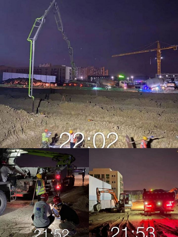 圖為夜間肥西安信立士項目1#樓基礎墊層混凝土澆筑及基礎開挖施工現場