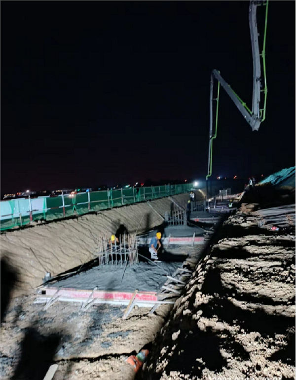 圖為夜間安徽建工交通智造基地建設項目鋼結構承臺混凝土澆筑場景