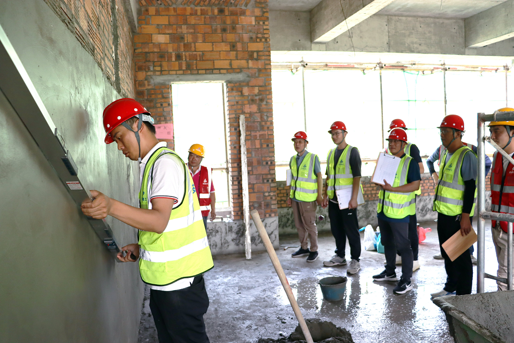 此次技能大賽選在阜南一小項目施工現場實際作業面進行比賽,即避免了砌筑抹灰成品的浪費,真正將技能競賽做實做細,又大大提升了全員的施工質量意識,達到了提升勞務隊伍專業技能,弘揚工匠精神,以賽促效、以賽促建的目的,整個比賽時限為2個小時。最終,評委組通過“看、摸、敲、照、靠、量、吊、套”,從完成度、觀感質量、垂直度、平整度及文明施工等規范要求方面進行現場綜合打分,并分別評選出一、二等獲獎和優勝參賽隊。