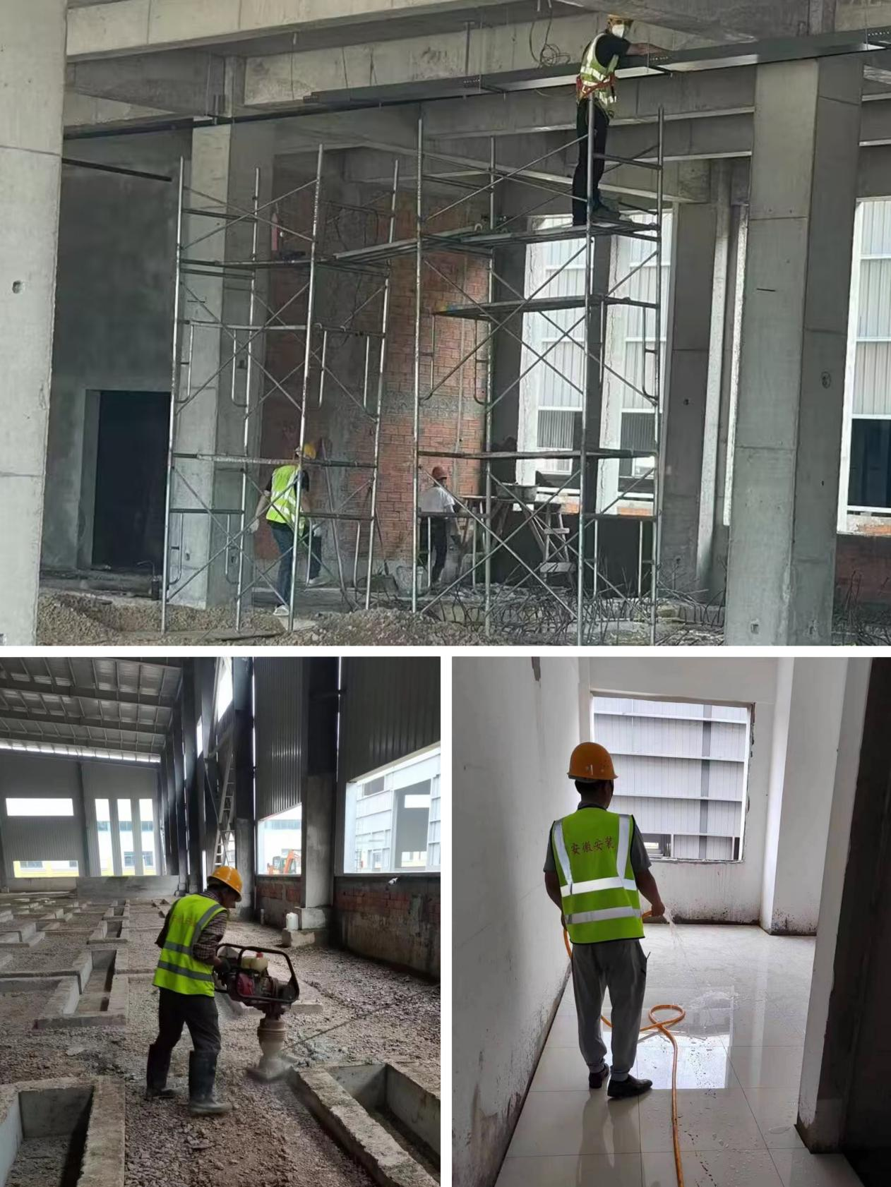 肥西安信立士項(xiàng)目現(xiàn)場(chǎng)正在進(jìn)行地基夯實(shí)、橋架安裝、瓷磚灑水養(yǎng)護(hù)