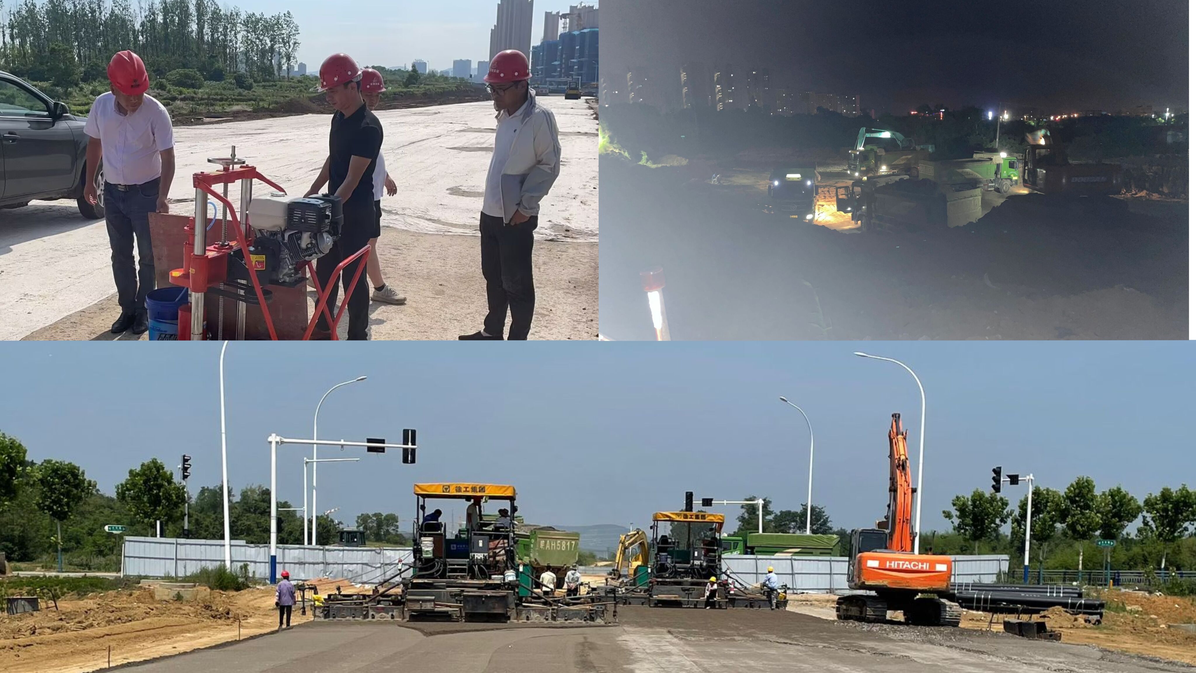 圖為:廬江縣新建立人路(福泉路-城西大道)工程水穩取芯試驗、土方夜間外運及快車道水穩攤鋪碾壓施工