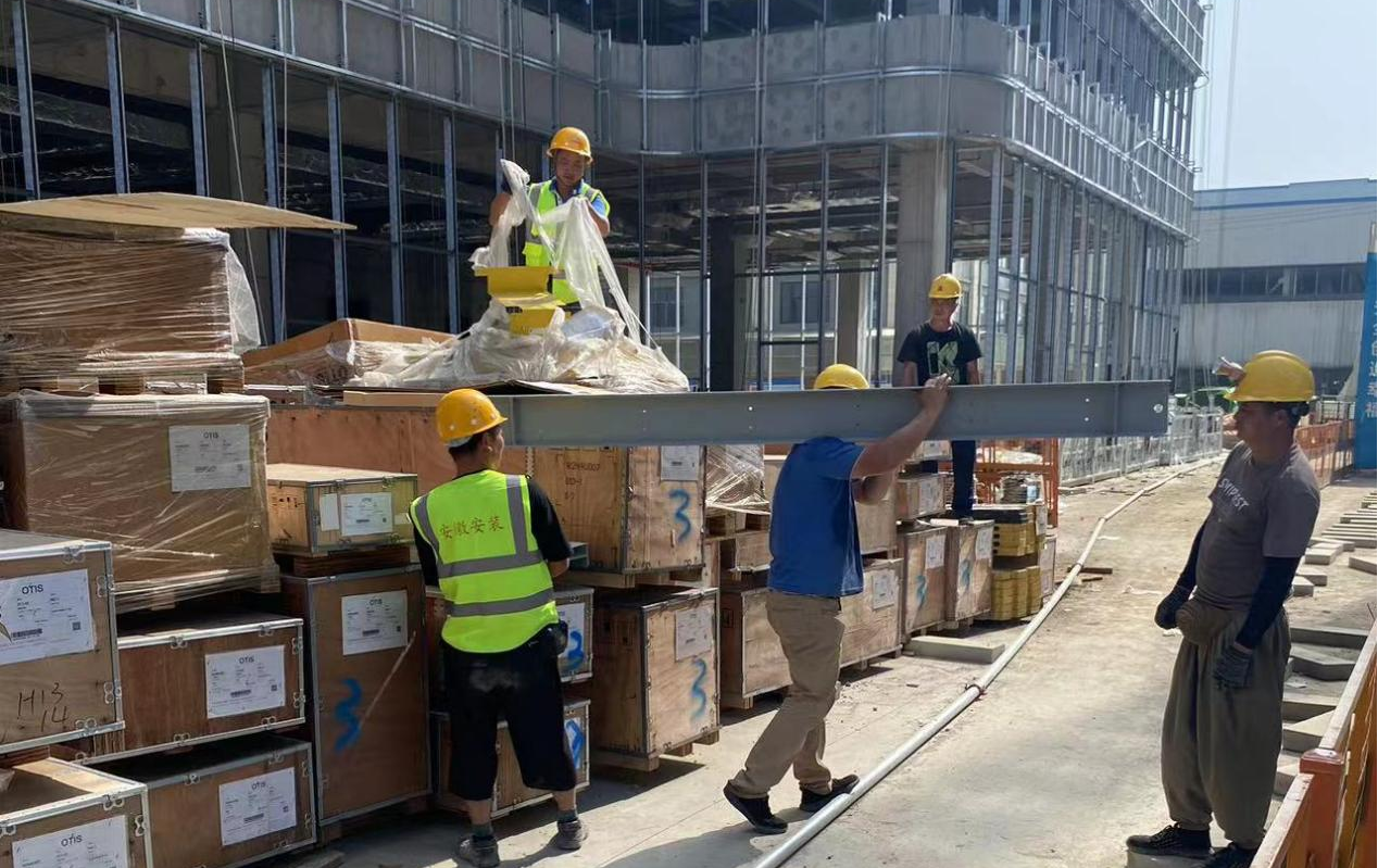 桃花科創產業園EPC總承包電梯安裝工程施工人員將驗收后的電梯設備搬運至電梯井道