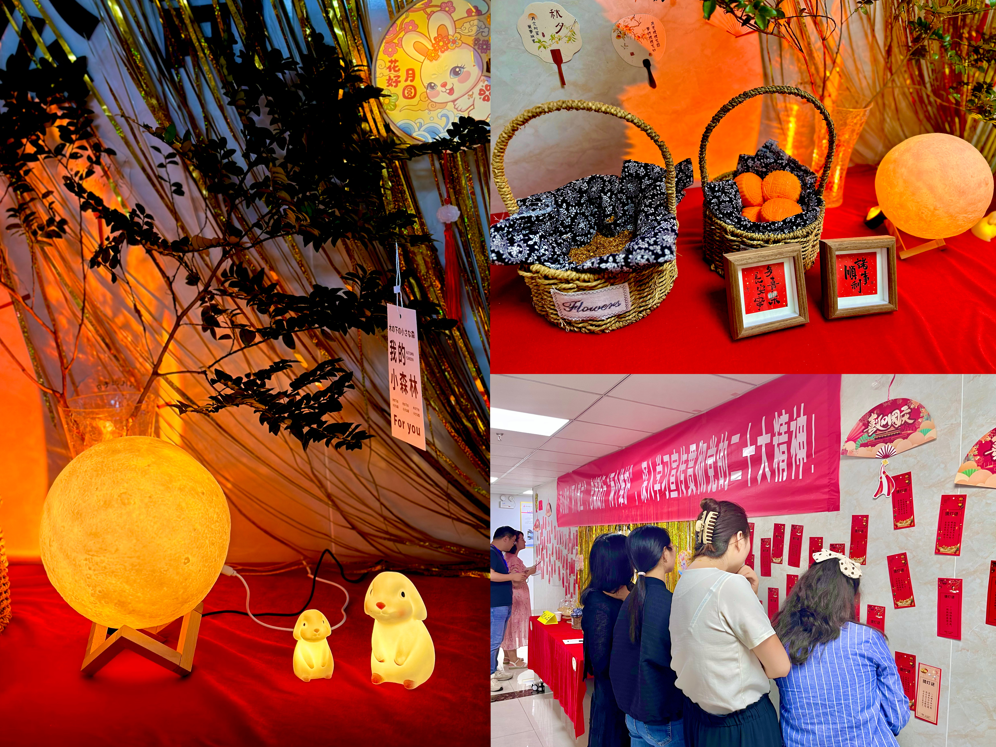 分公司工會購置月亮燈、玉桂兔、綠植、桂花籃、燈籠、貼畫等各種裝飾物,把整個分公司裝扮得喜慶又熱鬧,擺放各式月餅、綠豆糕等供大家品嘗。舉辦“猜燈謎”小游戲,在分公司背景墻貼上“燈謎”小卡片,大家紛紛駐足觀賞、熱情參與,節日氣氛值瞬間拉滿。