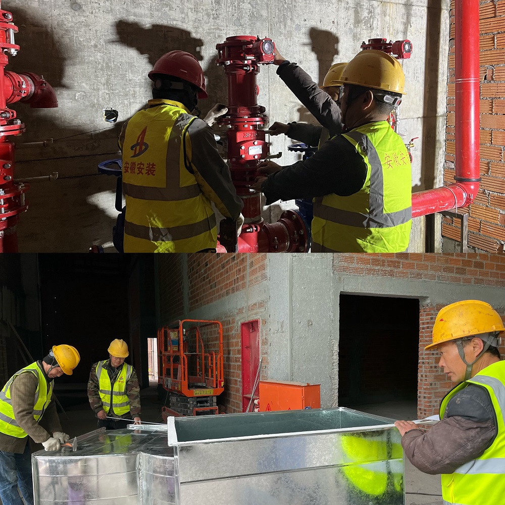 圖為:岳西中學建設項目(一期)安裝專業分包工程項目正在進行地下室濕式報警閥安裝、體育館風管加工