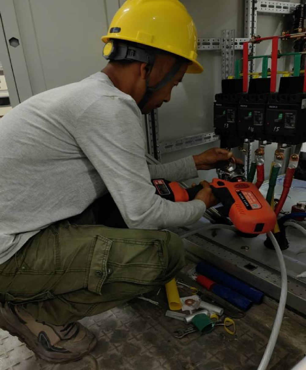 圖為工人使用壓線鉗制作電纜頭