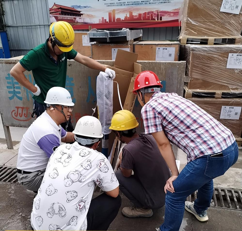 安徽大學(xué)綠色產(chǎn)業(yè)創(chuàng)新基地項(xiàng)目現(xiàn)場安裝人員正在進(jìn)行電梯開箱檢驗(yàn)