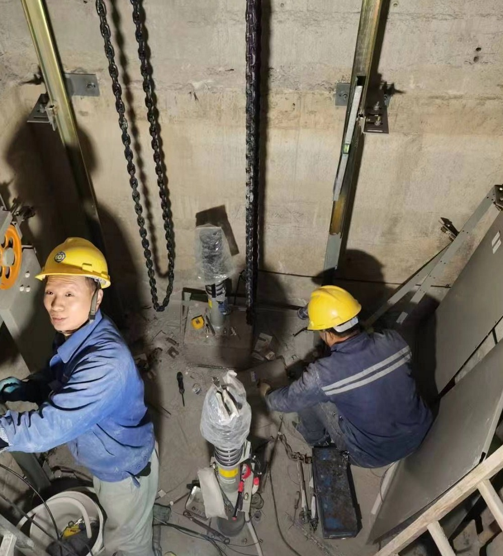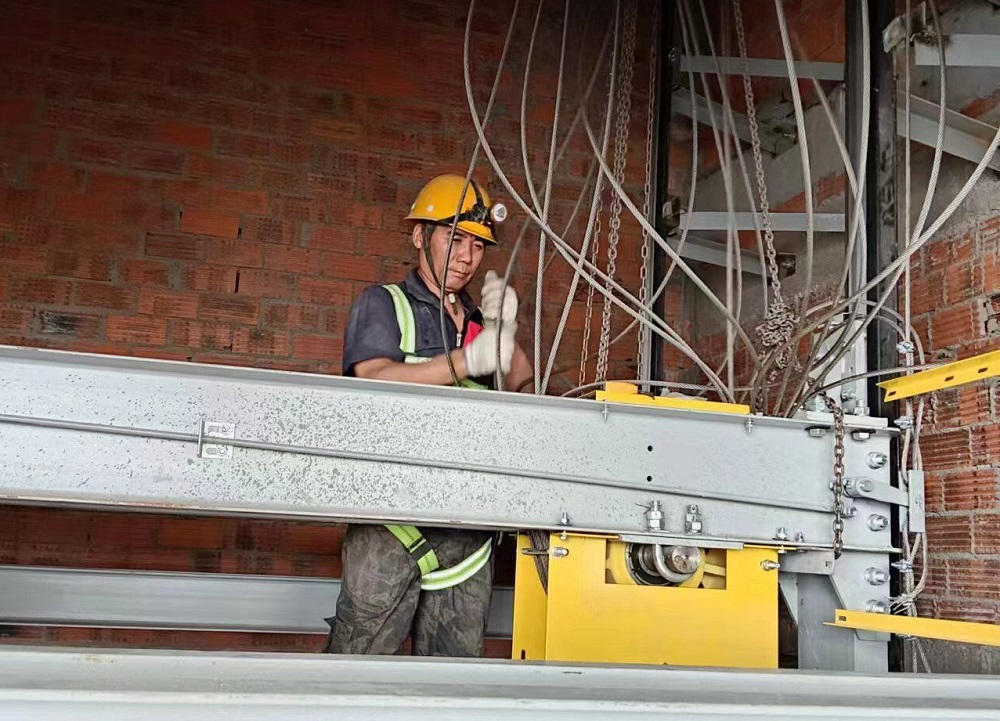 長三角一體化中新蘇滁高新區(qū)高端智能制造產(chǎn)研基地項(xiàng)目現(xiàn)場安裝人員正在收緊鋼絲繩、調(diào)整電梯緩沖距離