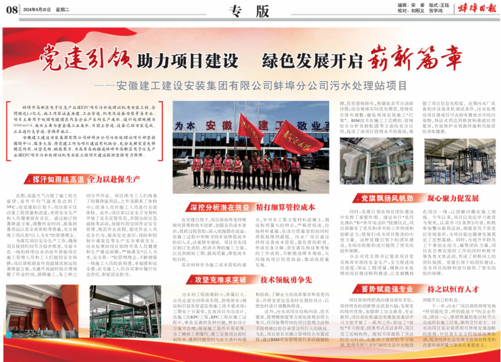 媒體聚焦丨蚌埠日?qǐng)?bào)專(zhuān)版報(bào)道安徽建工建設(shè)安裝集團(tuán)有限公司蚌埠分公司污水處理站項(xiàng)目 ——黨建引領(lǐng)助力項(xiàng)目建設(shè) 綠色發(fā)展開(kāi)啟嶄新篇章