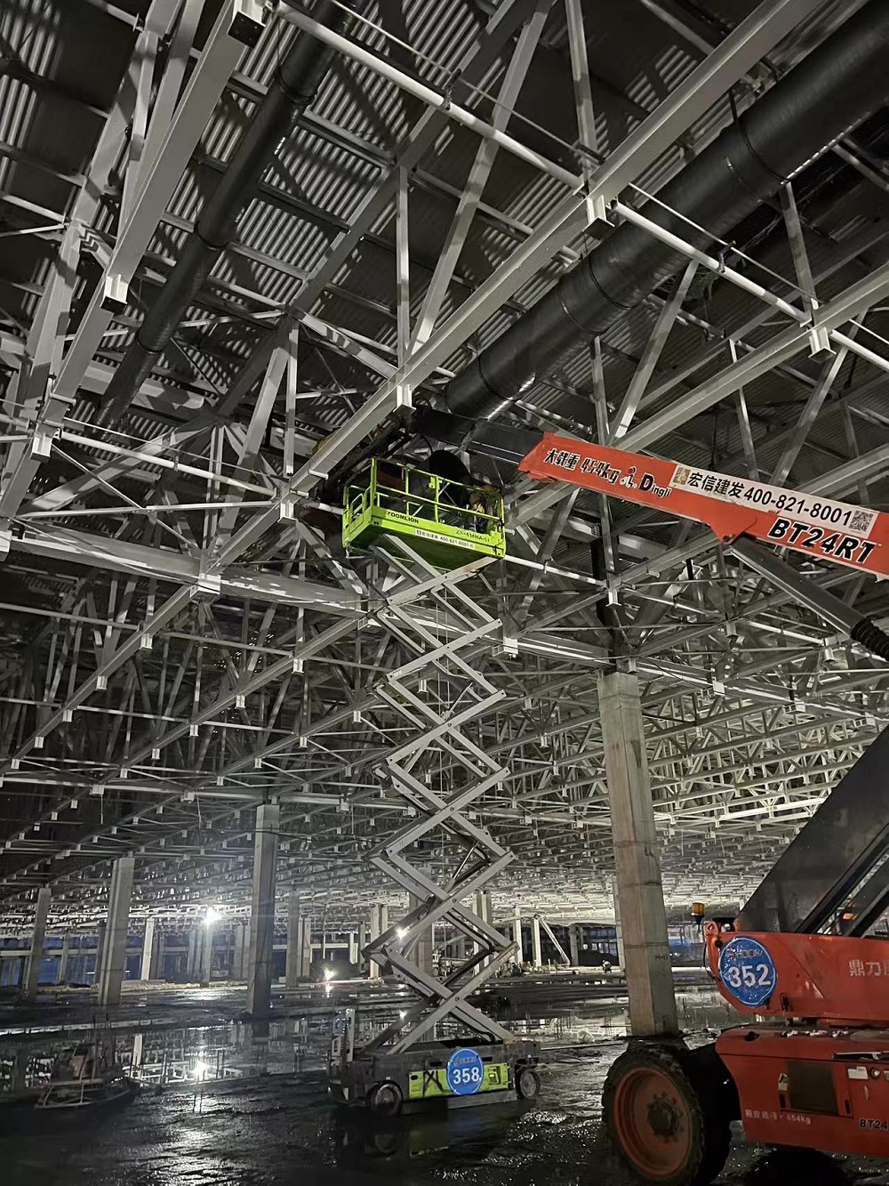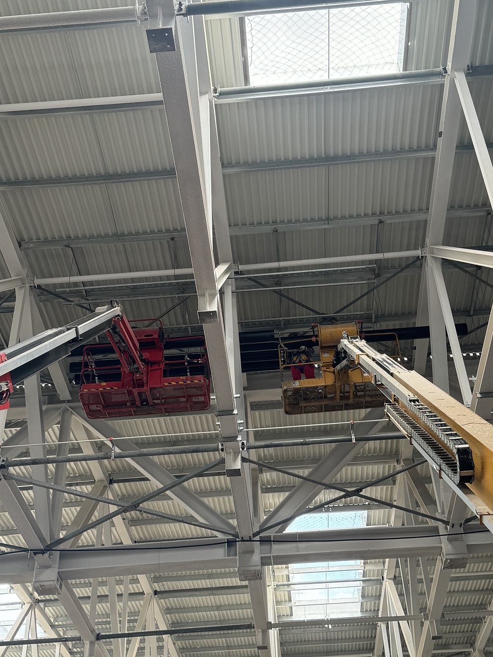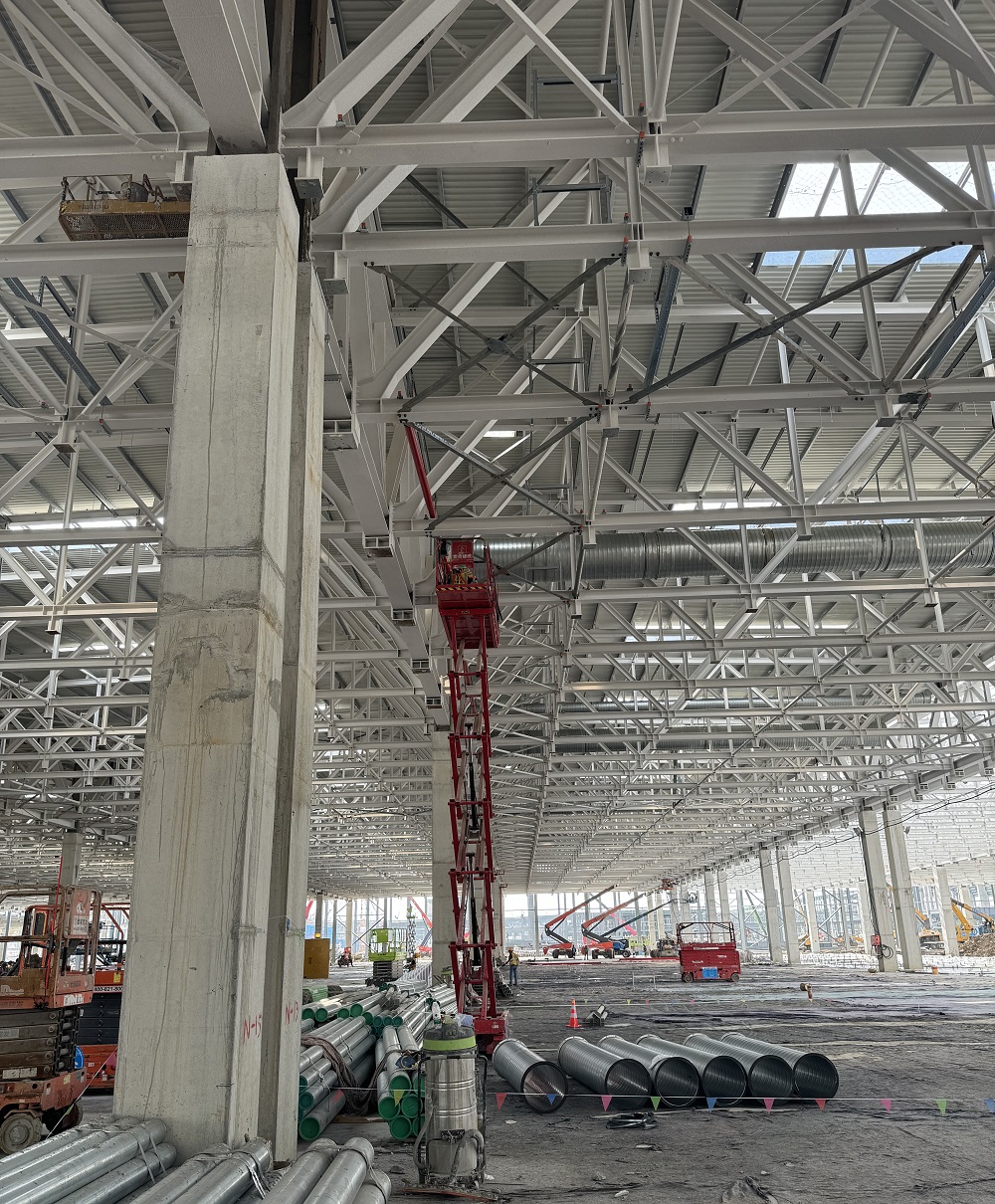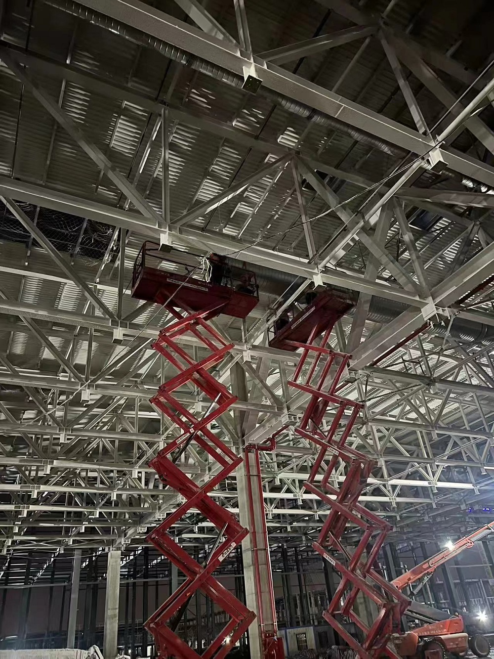 目前正在進行車間一1-6區通風管、照明管、橋架、虹吸雨水管、衛生間排水管、防雷接地、消防管等安裝作業,材料加工區預制各類管道支架也在同步推進。現已完成車間一風管安裝約3000平方米,風管預制約8000平方米,虹吸雨水管道安裝約120米,照明配管安裝約2000米,消防管道安裝約320米,防雷接地網安裝約10000米,橋架安裝約400米。