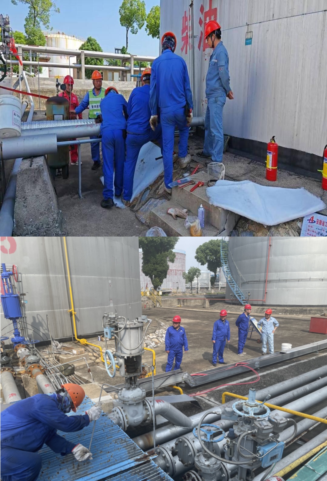在培訓演練的同時,隱患排查工作也在同步扎實推進。市政公司聯合安慶石化儲運部、設備工程部及青島安工院,對框架協議項目進行現場專業指導聯合檢查。針對檢查出的安全隱患,及時下發整改通知單,各班組迅速響應、逐項整改并反饋,形成了隱患排查治理的閉環管理。隨后,市政公司黨支部充分發揮黨建引領作用,支委班子深入儲運部五、七等罐區進出口管線增設緊急切斷閥門等項目一線,與儲運部作業區領導圍繞項目安全管理深入研討,并實地檢查施工進度與安全防護措施落實情況,將黨建工作與安全生產深度融合,全力保障項目安全有序推進。